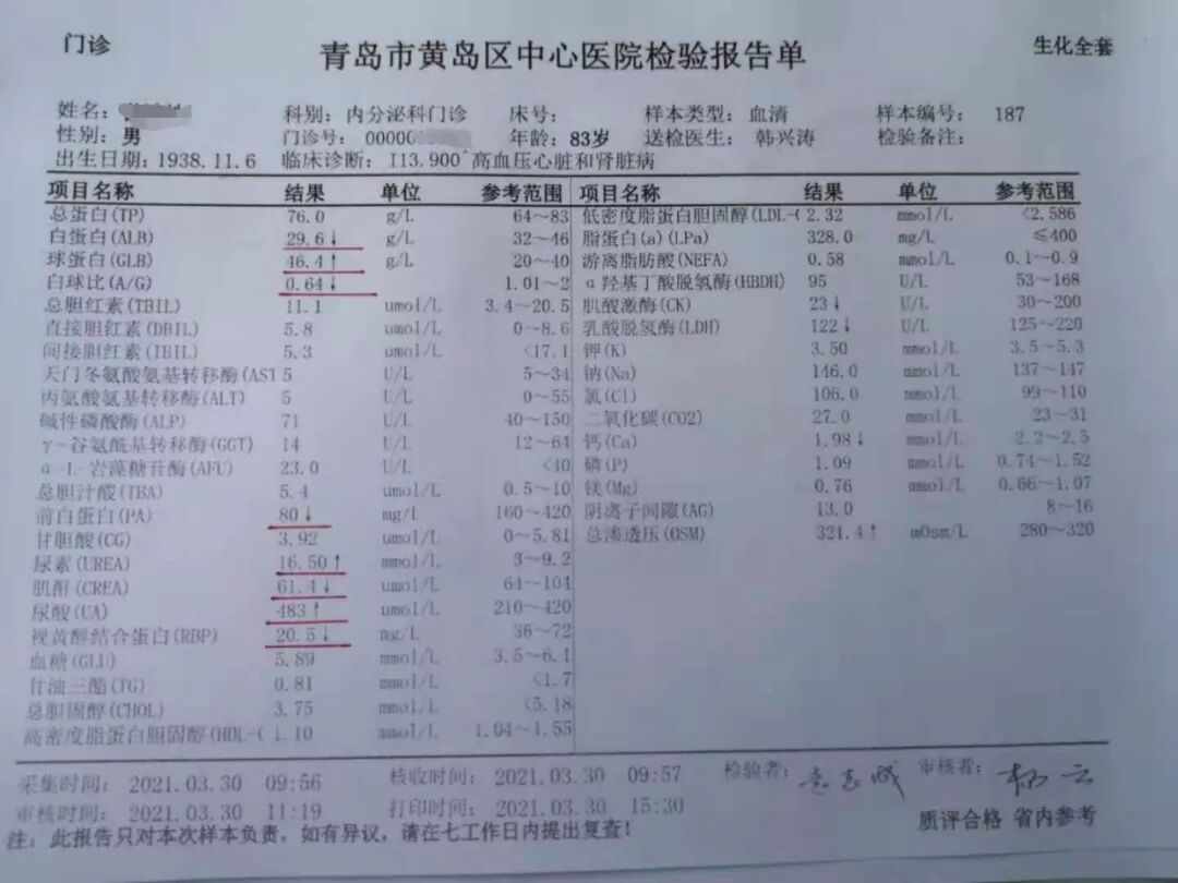 薛丹护士长详细询问并记录老人的身体情况,并进行简单的营养评估,安慰家属,等生化结果出来再进一步处理。下午检验结果出来显示低蛋白、贫血、肾功能不全。