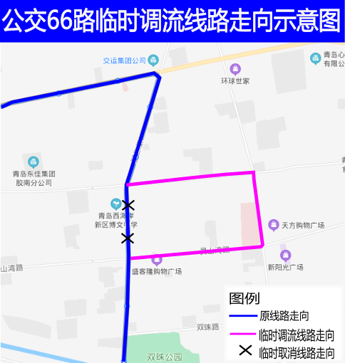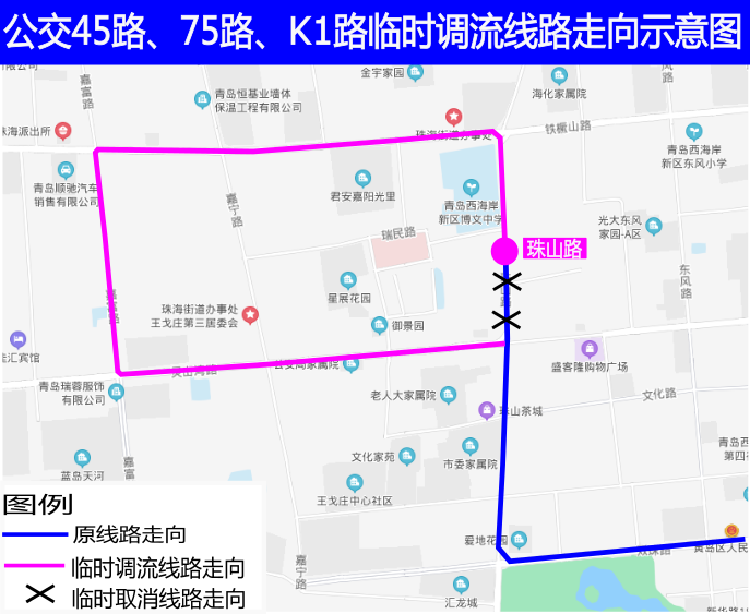 各位市民:受珠山路(灵山湾路-铁橛山路)道路封闭施工影响,公交K1路、45路、66路、75路无法正常通行,定于2021年4月6 日首班车起临时调整以上4条线路走向,具体调流方案如下:一、公交K1路(安子公交枢纽站-珠山路) (一)线路走向由安子公交枢纽站发车按原线路运行至双珠公园站后,经双珠路、珠山路、灵山湾路、嘉富路、铁橛山路、珠山路到达珠山路站;回程调流线路相同。(二)站点设置双向临时增设家家悦、嘉富路灵山湾路、珠海办事处,共3处站点。(三)运营指标运营服务时间及票价不变。二、公交45路(珠峰口-珠山路) (一)线路走向由珠峰口站发车按原线路运行至双珠公园站后,经双珠路、珠山路、灵山湾路、嘉富路、铁橛山路、珠山路到达珠山路站;回程调流线路相同。(二)站点设置双向临时增设家家悦、嘉宁路南、汇文小学、嘉富路灵山湾路、明梓集团(同806路)、嘉宁路、珠海办事处、第二中医医院,共8处站点。(三)运营指标运营服务时间及票价不变。三、公交75路(墨香路临港路-珠山路) (一)线路走向由墨香路临港路站发车按原线路运行至东楼路站后,经珠山路、灵山湾路、嘉富路、铁橛山路、珠山路到达珠山路站;回程调流线路相同。(二)站点设置双向临时增设家家悦、嘉宁路南、汇文小学、嘉富路灵山湾路、明梓集团(同806路)、嘉宁路、珠海办事处、第二中医医院,共8处站点。(三)运营指标运营服务时间及票价不变。附:公交K1路、45路、75路线路调流走向示意图四、公交66路(青岛西站-珠山秀谷)(一)线路走向由青岛西站发车按原线路运行至珠海办事处北站后,沿珠山路、铁橛山路、琅琊台路、灵山湾路、珠山路到达东楼路站后恢复原线路运行;回程调流线路相同。(二)站点设置1、双向临时增设光大梦之都、东风小学、新华路北、人民医院东、人民医院、国旅大酒店,共6处站点。2、双向临时取消第二中医医院1处站点。(三)运营指标运营服务时间及票价不变。(四)线路调流走向示意图由此给您乘车带来的不便敬请谅解,待道路施工完毕,我们将及时恢复原线路运行。敬请周知。