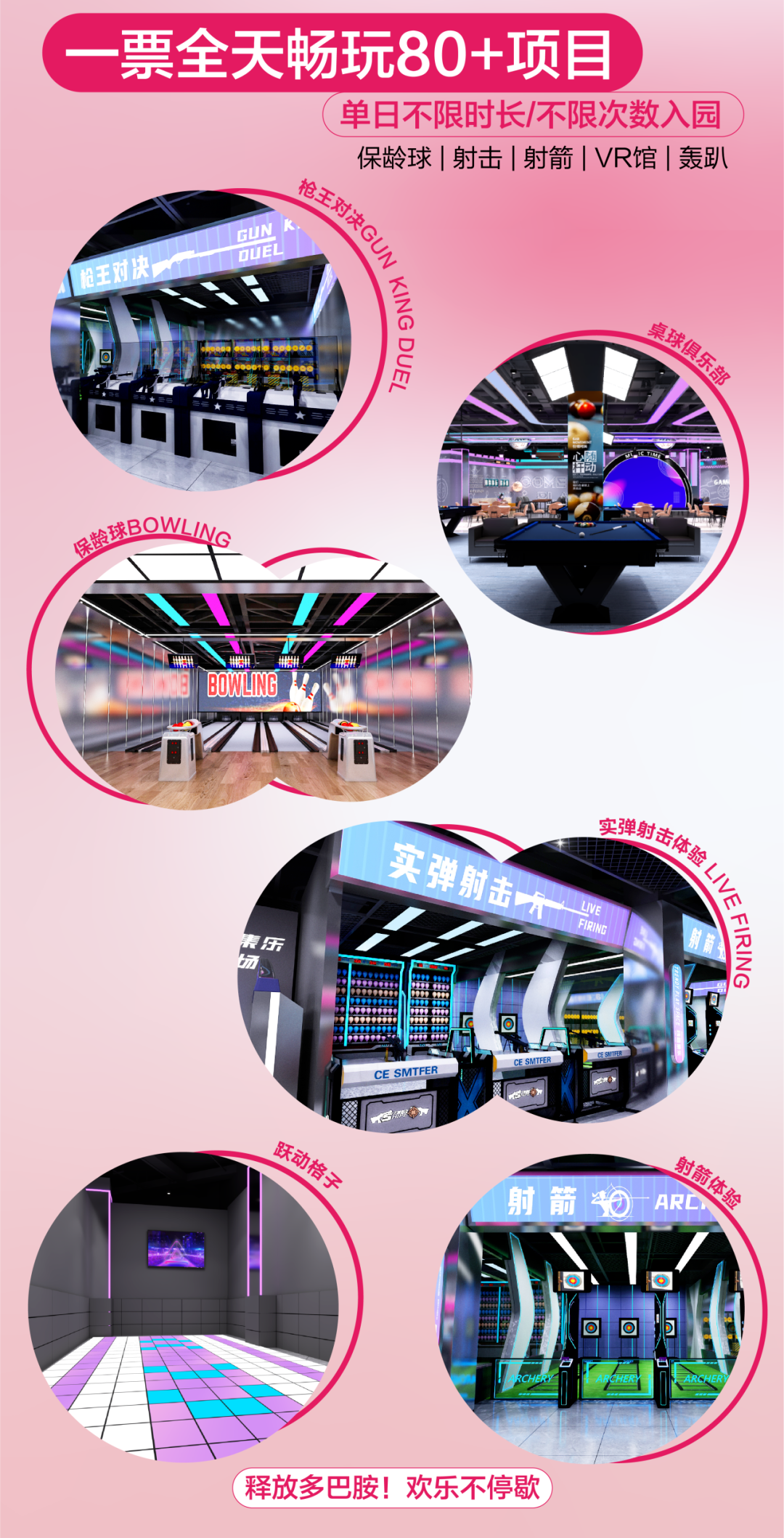 “动感竞技场”“枪王对决”“实弹射击”“炫动单车”“金刚战士”“巅峰狙击”……每一个项目都能带给市民游客惊险刺激的体验。“科技社交汇”,让市民游客步入VR馆即可开启奇幻冒险,通过“宇宙一号”“伞途”“双人360”“乐享滑雪”等7大尖端设备穿梭虚实之境。“声控派对”“开放式舞台”点燃社交热情,桌游、碰碰车、台球、飞镖、模拟网球、“悦动格子”“360°单车”等丰富选择满足不同兴趣群体,更有私密“轰趴房”和舒适“太空舱”提供专属聚会与休憩空间。