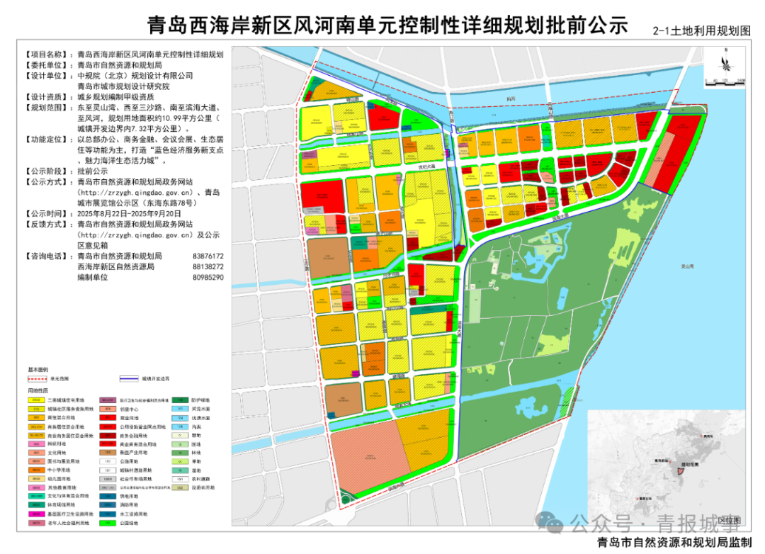 青岛西海岸新区风河南单元控制性详细规划东至灵山湾,西至三沙路,南至滨海大道,北至风河,规划用地面积约10.99平方公里(城镇开发边界内7.32平方公里)。功能定位以总部办公、商务金融、会议会展、生态居住等功能为主,打造“蓝色经济服务新支点、魅力海洋生态活力城”。