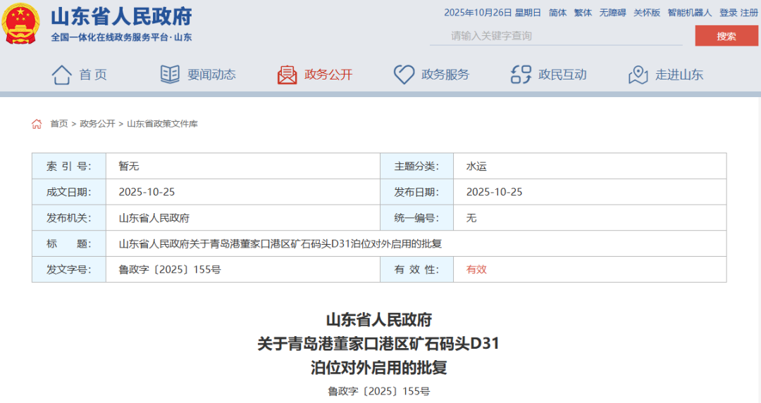 你市《关于青岛港董家口港区矿石码头D31泊位验收并对外启用的请示》(青政呈〔2025〕50号)收悉。经省政府有关部门和中央驻鲁口岸查验单位验收,青岛港董家口港区矿石码头D31泊位符合对外启用条件,批准其对外启用。