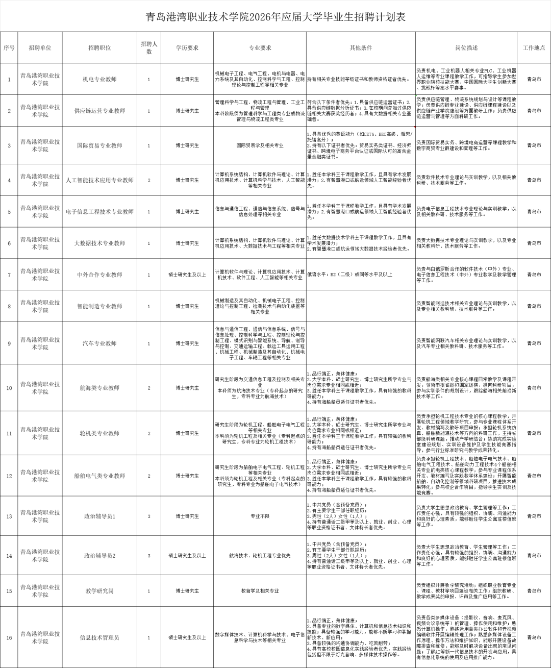 应聘条件和资格、考察体检、注意事项等详细内容请点击查看>>>青岛港湾职业技术学院2026年应届大学毕业生招聘简章