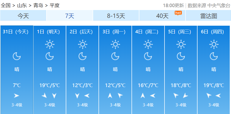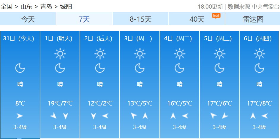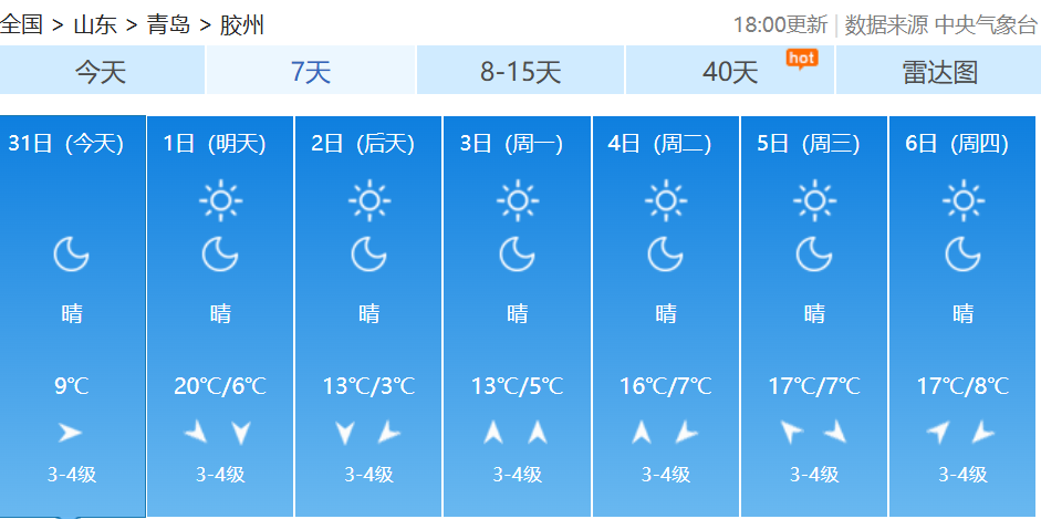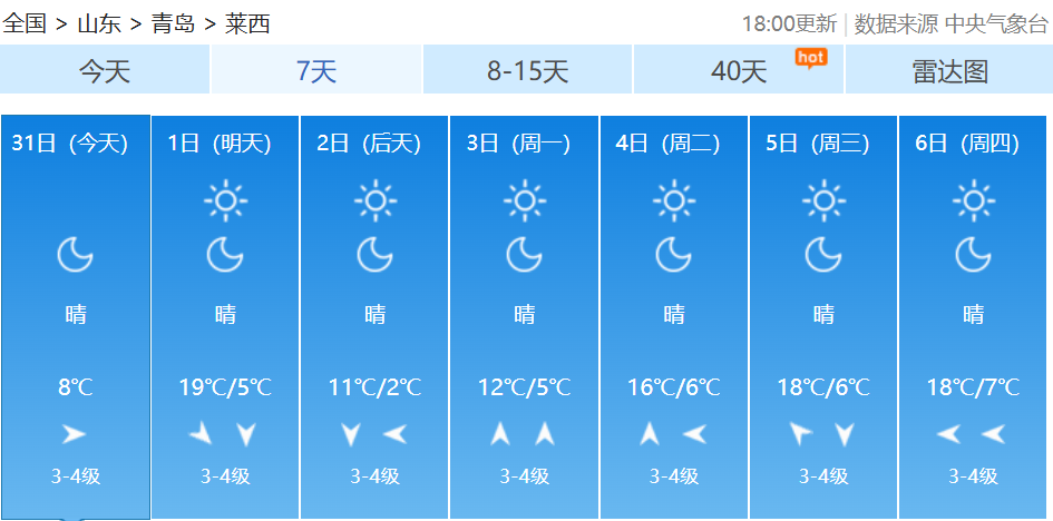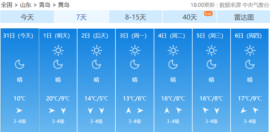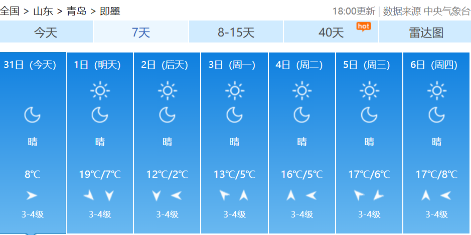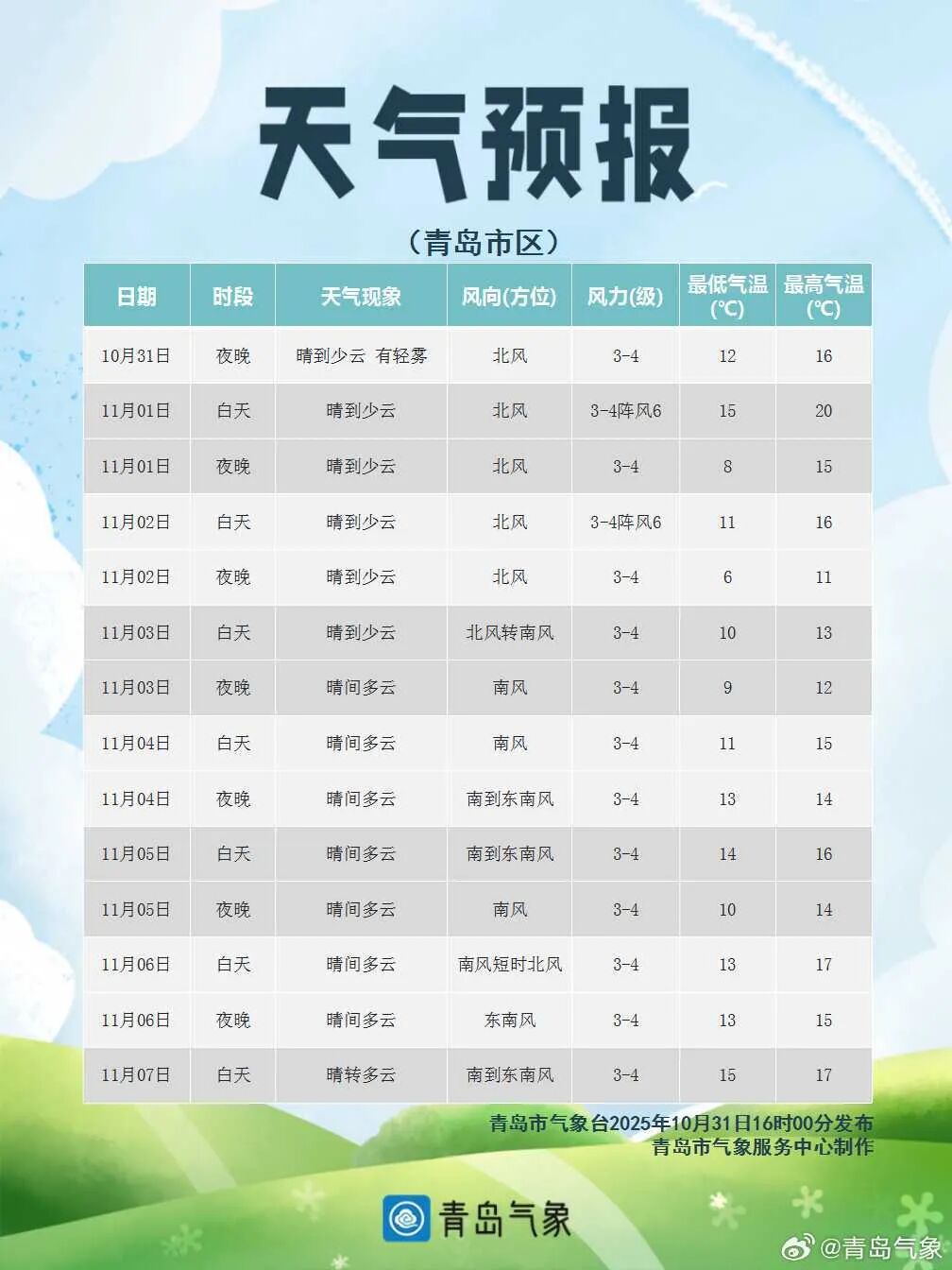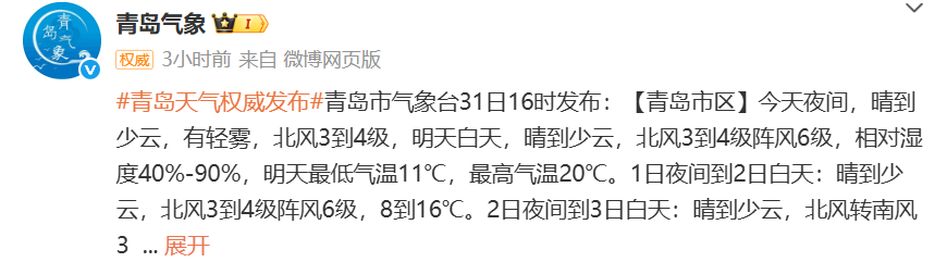 10月中下旬以来受冷空气频繁影响北方大部气温偏低不少地方早早入冬有网友吐槽:“秋装还没机会出场,冬天就来了”10月31日至11月2日随着一股冷空气来袭北方多地气温下降南方在阴雨影响下湿凉上线小编奉上2025全国穿衣指数地图提醒大家注意添衣保暖↓↓↓ 青岛天气预报 据@青岛气象 最新预报受冷空气影响周六起青岛气温逐日下降从周六夜间开始全市低温将集体跌至个位数周六夜间至下周一凌晨中北部部分地区的低温甚至会接近0℃↓↓↓11月1日,我们将在明媚阳光中开启新的月份,在阳光加持下,全市的最高气温会有小幅提升到19~20℃。受冷空气影响,周六起我市气温逐日下降,到了下周一,全市的最高气温只有12~13℃了;最低气温下降趋势更为显著,从周六夜间开始,全市低温将集体跌至个位数,周六夜间至下周一凌晨,中北部部分地区的低温甚至会接近0℃。青岛市气象台10月31日16时发布未来三天天气预报↓↓↓【青岛市区】11月1日白天,晴到少云,北风3到4级阵风6级,相对湿度40%~90%,1日最低气温11℃,最高气温20℃。1日夜间到2日白天:晴到少云,北风3到4级阵风6级,8到16℃。2日夜间到3日白天:晴到少云,北风转南风3到4级,6到13℃。【预报各区】11月1日白天,晴到少云,内陆局部有雾,北风,海上5到6级阵风7到8级,内陆3到4级阵风6级,1日最低气温7℃,最高气温20℃。1日夜间到2日白天:晴到少云,北风3到4级阵风6级。2日夜间到3日白天:晴到少云,北风转南风3到4级。未来7天青岛多地昼夜温差较大↓↓↓近日早晚寒意明显注意添衣保暖--------------------●来源:半岛都市报(bandaobao)综合中国天气网、@青岛气象等