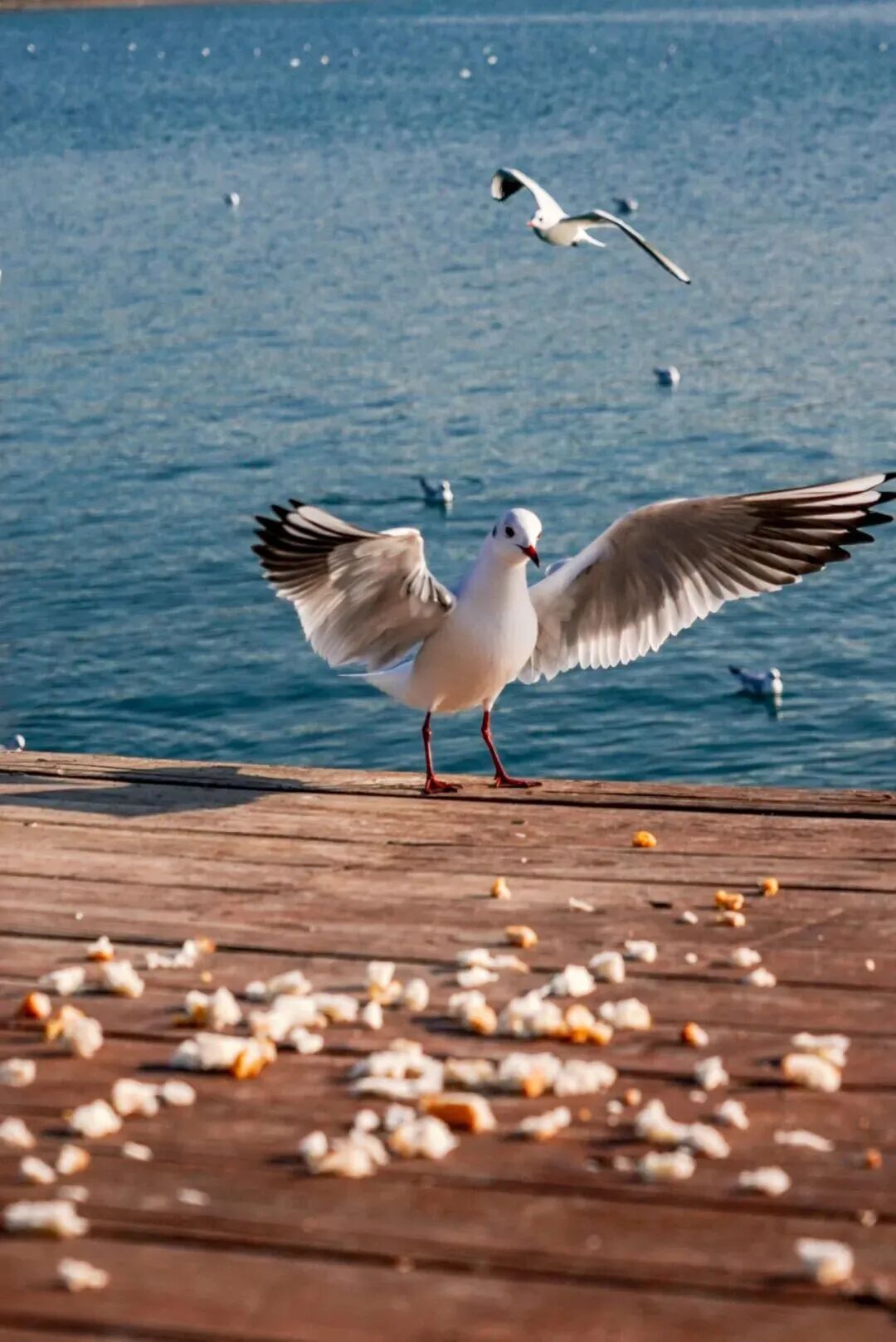 喂鸥时应以抛喂为主,要一粒一粒抛向空中,避免过多的饲料掉入水中,这些饲料如果不能及时被海鸥取食,大量在水中浸泡积累会对水质造成污染。