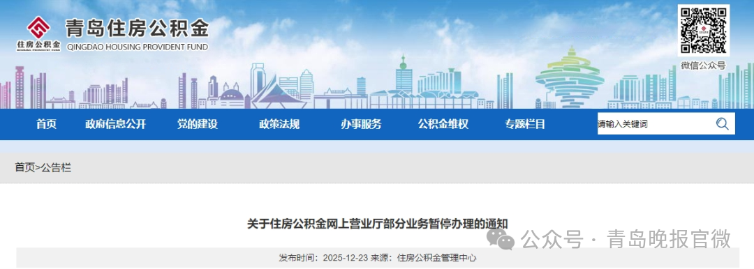 因住房公积金相关业务调整,青岛市住房公积金网上营业厅中的提前部分还款、提前结清、逾期还款、配偶内转还款授权业务于12月23日(周二)17点至20点暂停办理,给您带来不便,敬请谅解!