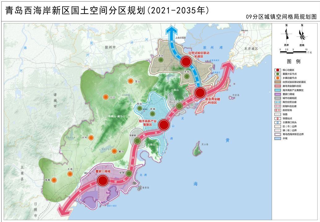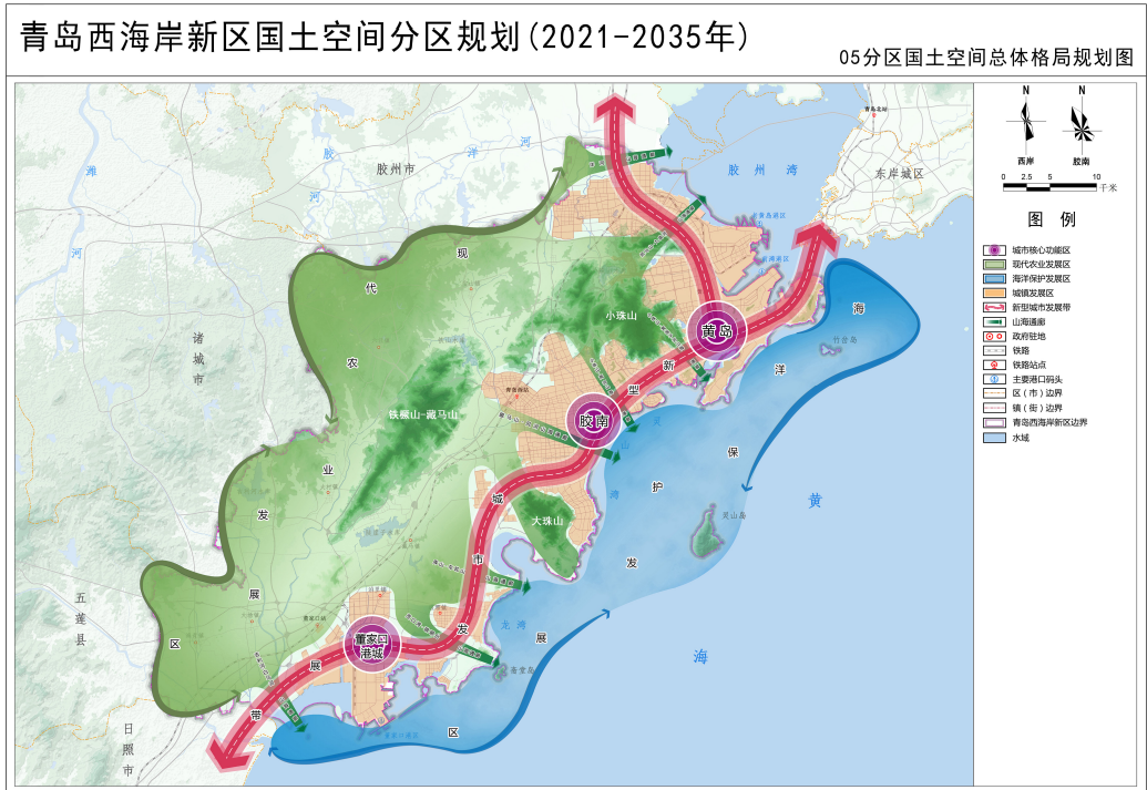 依托滨海大道、轨道线网,构建组团布局的新型城市发展带,形成“一核三区、轴带贯通,组团发展”的高质量发展空间布局。一核三区:以自贸试验区联动拓展区为核心,着力构建唐岛湾金融科创区、海洋高新产业集聚区、董家口新港城三个动力源。轴带贯通:以204国道至滨海沿线为轴带,依托自贸试验区、联动上合示范区,建设海空自贸走廊;以滨海大道为轴带,依托高校、科研院所及各类研发中心,建设滨海科创走廊。组团发展:依托功能区和特色小镇,统筹城乡融合发展,推动主导产业向功能区集聚、富民产业向镇驻地集中,建设产城融合、功能完善的城镇组团,形成“区域共进、全域融合”发展新局面。
