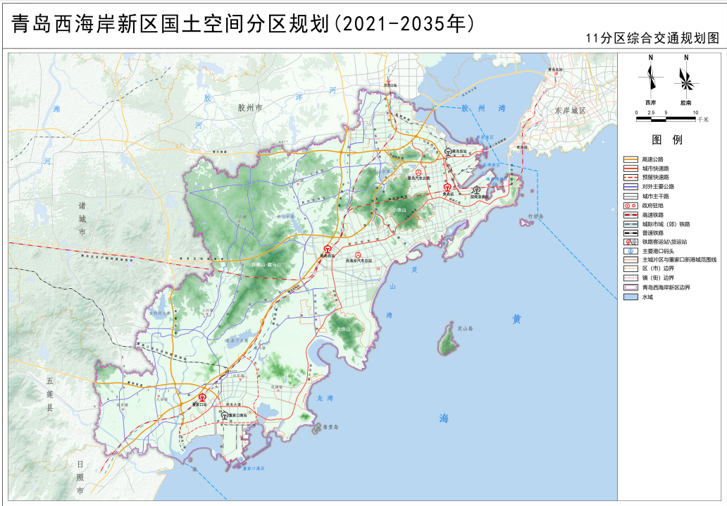 增强新区与胶东国际机场交通联系。完善由铁路、高快速路、国省道、轨道交通等组成的陆域衔接网络。支持通用航空和低空经济发展。结合空域、陆域条件及通用航空发展需求,在西海岸新区北部、环胶州湾区域规划布局通用航空基础设施,发展医疗救援、警用航空、海上搜救、森林消防、港口引航等功能,兼具旅游观光功能。