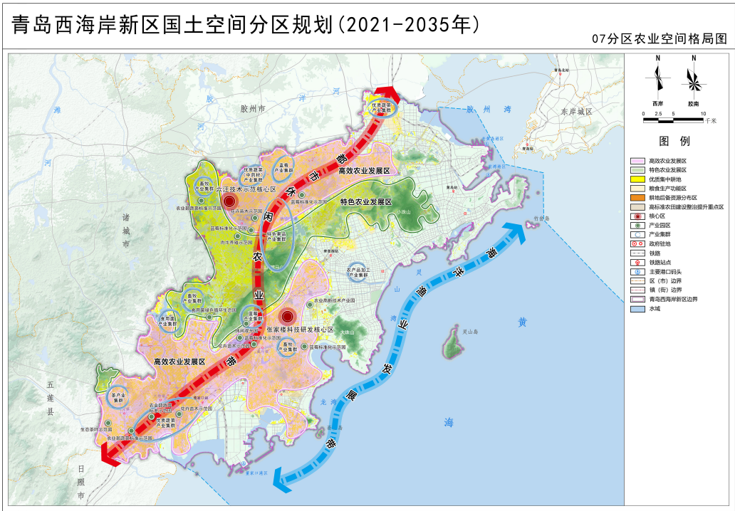 构建“六核引领,轴带联动”的乡村振兴总体格局。六核引领:以现代农业示范区、董家口循环经济区、西海岸交通商务区、藏马山国际旅游度假区、王台新动能产业基地、古镇口军民融合示范区等“六大活力源”,培育乡村振兴新引擎。轴带联动:依托交通网络和资源禀赋,构建“滨海城乡融合发展带,开城路、东岳路、瓦韩路、南北大通道四条城乡联动发展轴”的“一带四轴”的发展格局,推动城乡融合发展。