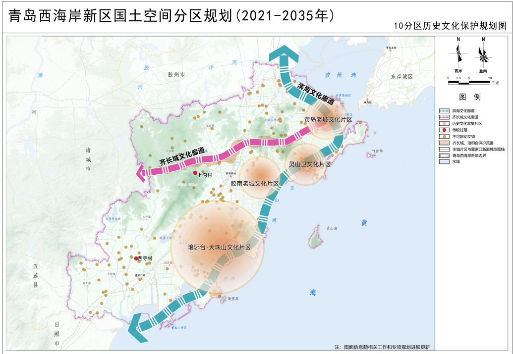 对新区内的历史要素实施历史文化保护线分类分级管控。落实齐长城和琅琊台2处历史文化保护线,严格按照《中华人民共和国文物保护法》《山东省齐长城遗址保护规划》等相关要求进行保护,保护范围内不得进行文物保护工程以外的其他建设工程或者爆破、钻探、挖掘等作业,确保文物本体及周边环境得到有效保护。