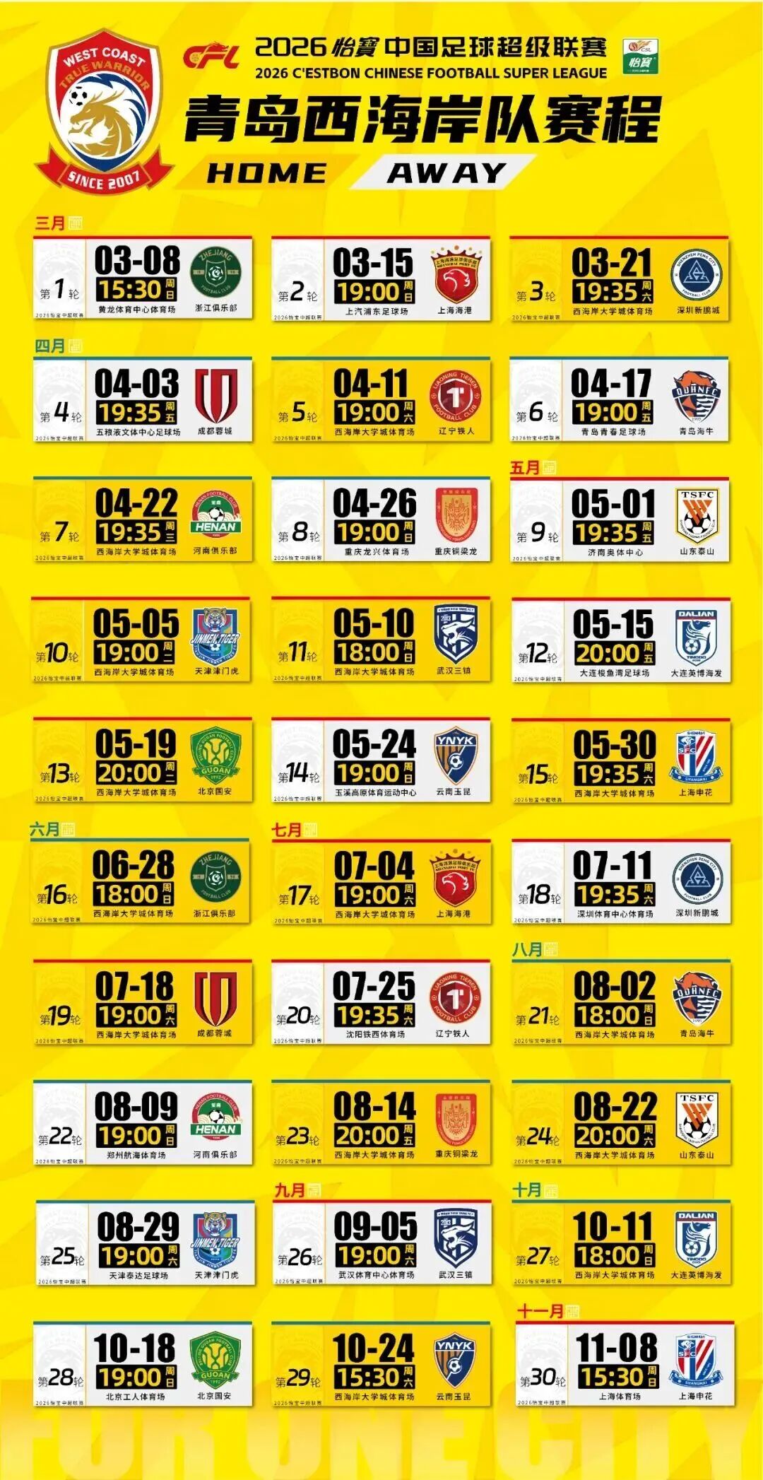 青岛西海岸队完整赛程出炉。