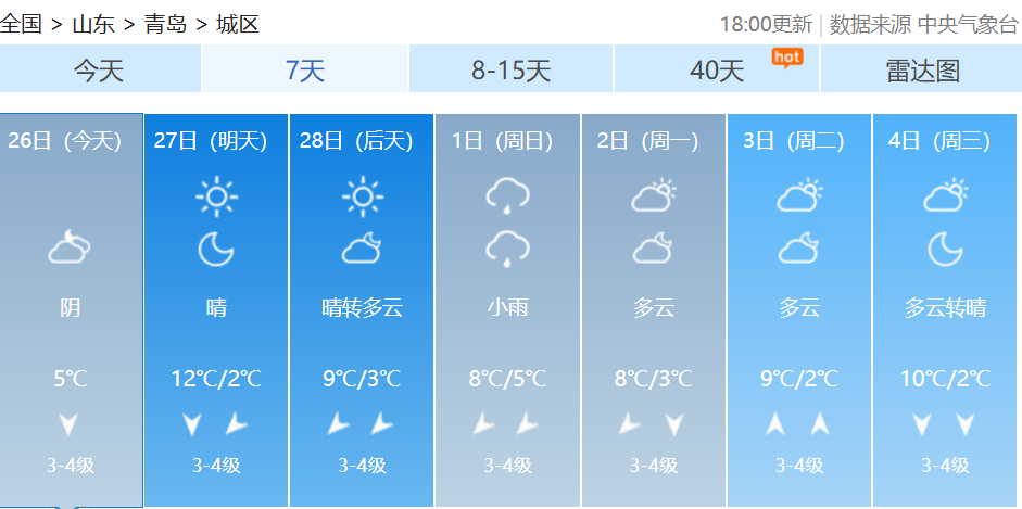 近日气温波动频繁本周日青岛再迎降雨天气据@青岛气象 最新预报3月份一开场我市将会迎来降雨过程↓↓↓27日白天,天空转晴,风力轻柔,各区市的最高气温会纷纷上升到12℃上下,感受舒适。28日白天,天气依然不错,维持晴朗的姿态,全市最高气温自南向北在8~12℃之间。目前来看,3月份一开场,我市将会迎来降雨过程,请多关注最新的气象信息,做好相应的防范。图/@青岛气象青岛市气象台26日16时发布未来三天天气预报↓↓↓【青岛市区】27日白天,多云转晴,北风短时南风3到4级,相对湿度55%~95%。27日最低气温5℃,最高气温12℃。27日夜间到28日白天:晴间多云,东北风短时东南风3到4级,2到9℃。2月28日夜间到3月1日白天:多云转阴有小雨,东北风3到4级,6到8℃。【预报各区】26日夜间到27日白天,阴有分散性阵雨转晴,有轻雾,局部有雾,北风短时南风,海上5到6级,内陆3到4级。27日最低气温1℃,最高气温13℃。27日夜间到28日白天:晴间多云,东北风短时东南风3到4级。2月28日夜间到3月1日白天:多云转阴有小雨,东北风3到4级。图/@青岛气象据中国天气网预报未来7天青岛气温小幅波动本周六起,气温下降本周日,将迎降雨↓↓↓图/中国天气网转发提醒-------------------●来源:半岛都市报(bandaobao)综合中国天气网、@青岛气象