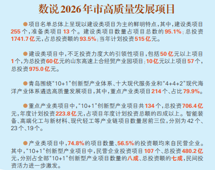 近日,青岛市发展改革委印发2026年市绿色低碳高质量发展重点项目(简称“市高质量发展项目”)名单,确定2026年市高质量发展项目268个,总投资1863.1亿元。