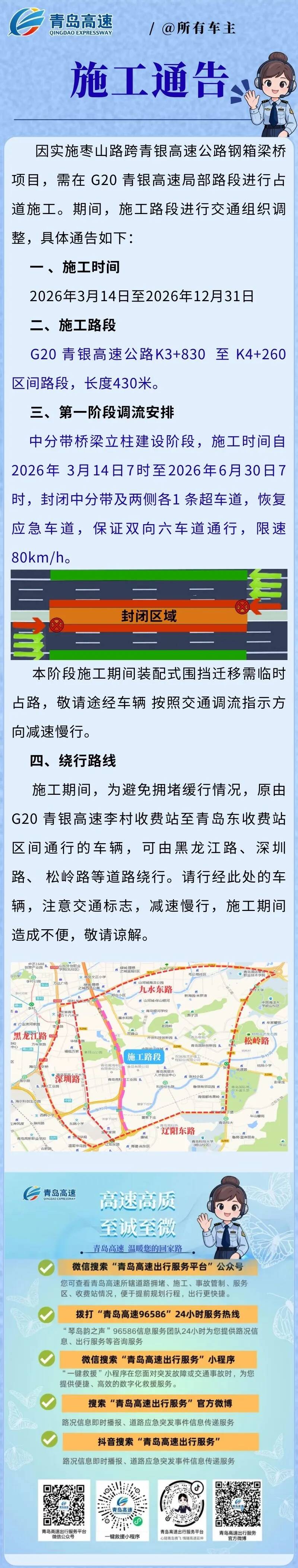 青银高速局部路段占道施工,途经李村收费站至青岛东收费站区间的车辆可绕行!
