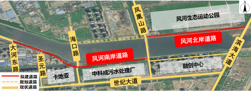 其中,风河南岸道路西起峄山路与大河东路交叉口,与现状凤玉路顺畅衔接,东至凤凰山路,全长约1928米,建设内容涵盖道路、桥梁、地道、管线及绿化照明等配套设施;北岸道路西起凤凰山路,东至滨海大道,全长约1370米,同步完善管线、绿化等附属设施,全方位保障通行体验。