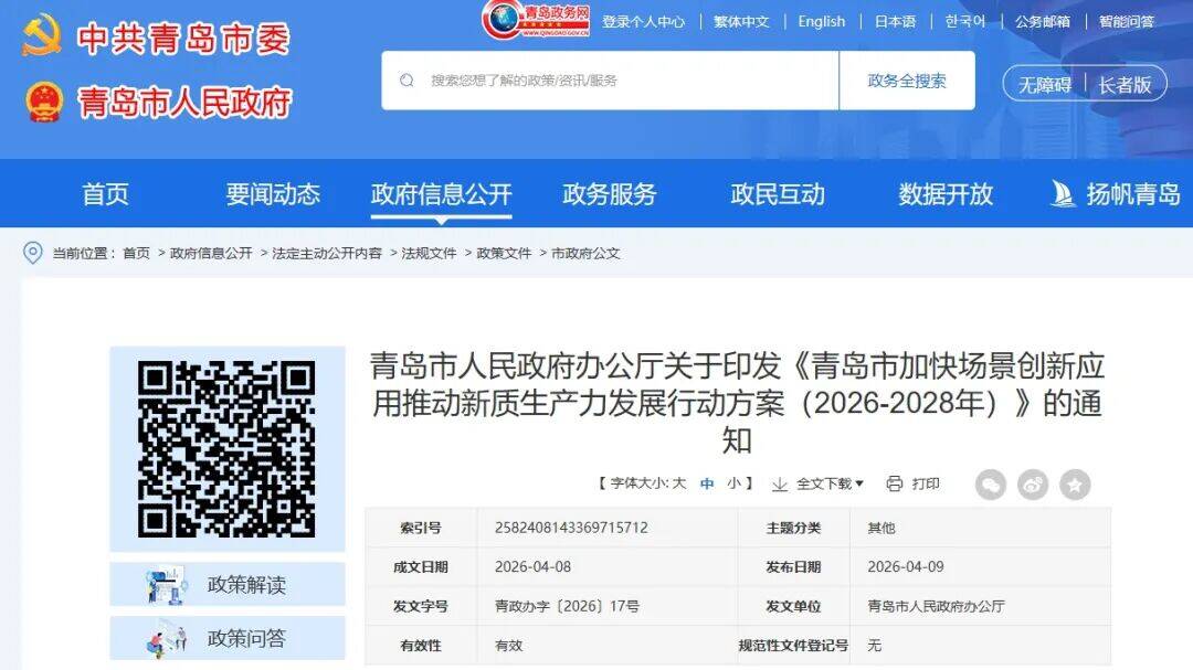 点击查看>>>青岛市人民政府办公厅关于印发《青岛市加快场景创新应用推动新质生产力发展行动方案(2026-2028年)》的通知