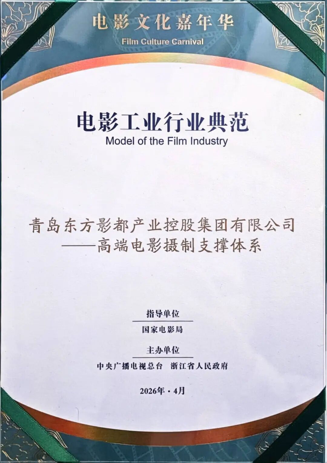 4月15日,在浙江宁波举行的电影文化嘉年华活动上,东方影都“高端电影摄制支撑体系” 荣获电影工业行业典范。