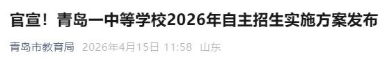 据“青岛市教育局”官方微信消息,青岛一中等学校制定的2026年自主招生实施方案经市教育局研究同意,现予以公布。